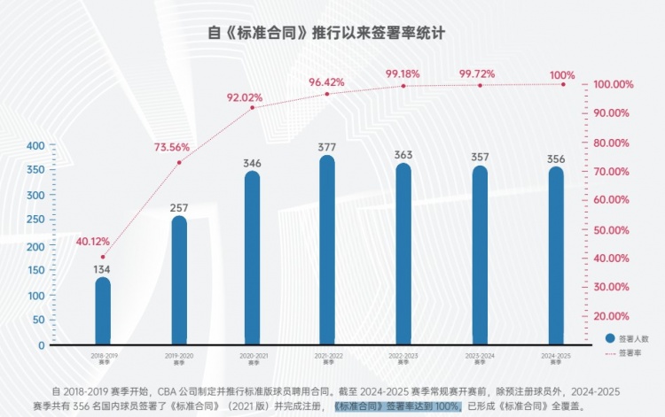 自2018-2019赛季开始,CBA 公司制定并推行标准版球员聘用合同。截至2024-2025赛季常规赛开赛前,除预注册球员外,2024-2025赛季共有 356 名国内球员签署了《标准合同》(2021 版)并完成注册,《标准合同》签署率达到100%,已形成《标准合同》全覆盖。