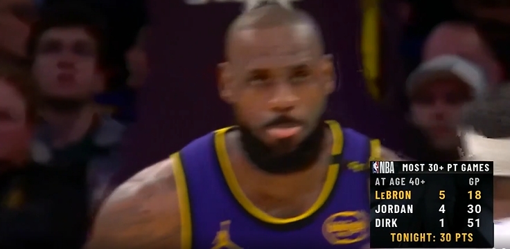 - 詹姆斯40岁后18场比赛已经砍下5次30+ 是其他人之和