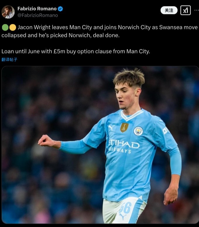 - 罗马诺:雅各布-赖特将租借加盟斯旺西,后者可500万镑买断