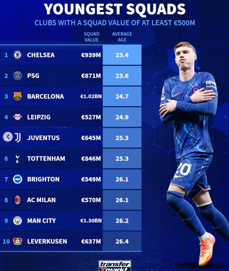 各队平均年龄最年轻榜:切尔西巴黎巴萨列前三,尤文米兰曼城在列