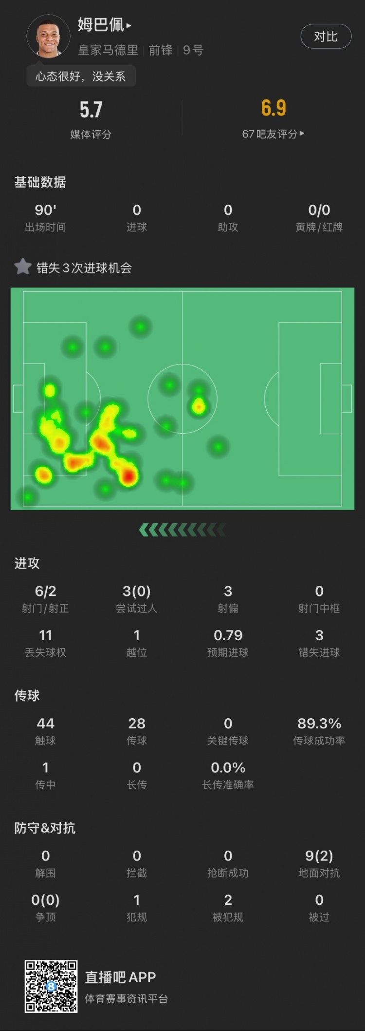 - 姆巴佩本场:错失3次良机,3次过人0成功,1越位,5.7分全场最低